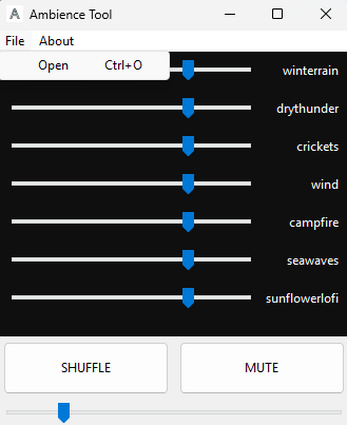 The purpose of this tool is to be a utility in helping you stack multiple audios, which will be continuously looped. Perfect for ambience sound stacking. Each sound gets a slider, that allows you to manipulate its volume until you have a fitting ambience to enjoy!